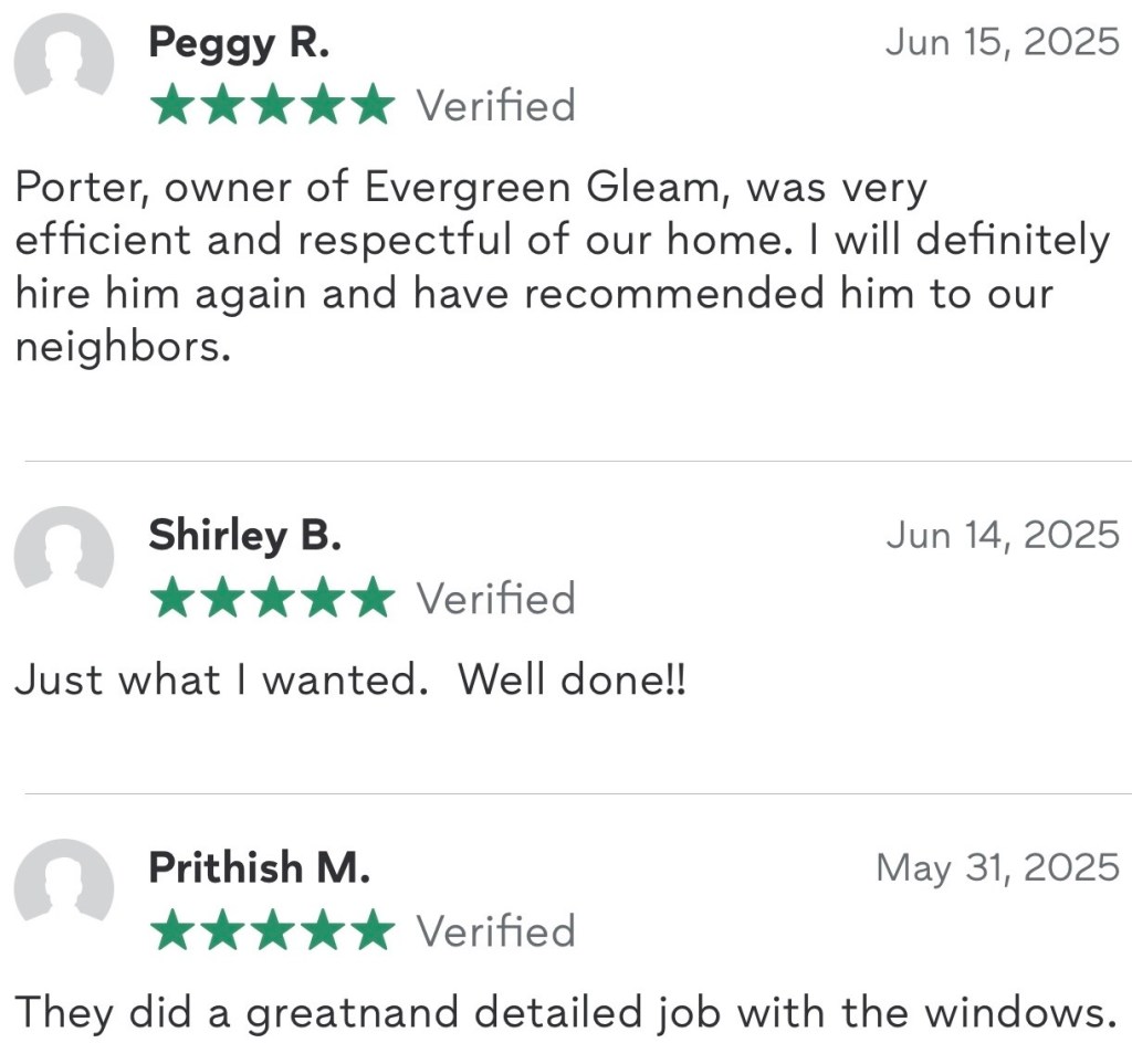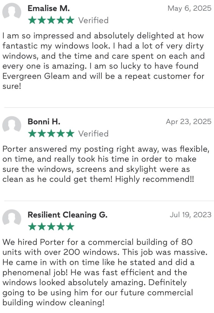 From small homes to large commercial projects, Evergreen Gleam delivers reliable, high-quality window cleaning with a focus on craftsmanship and consistency.